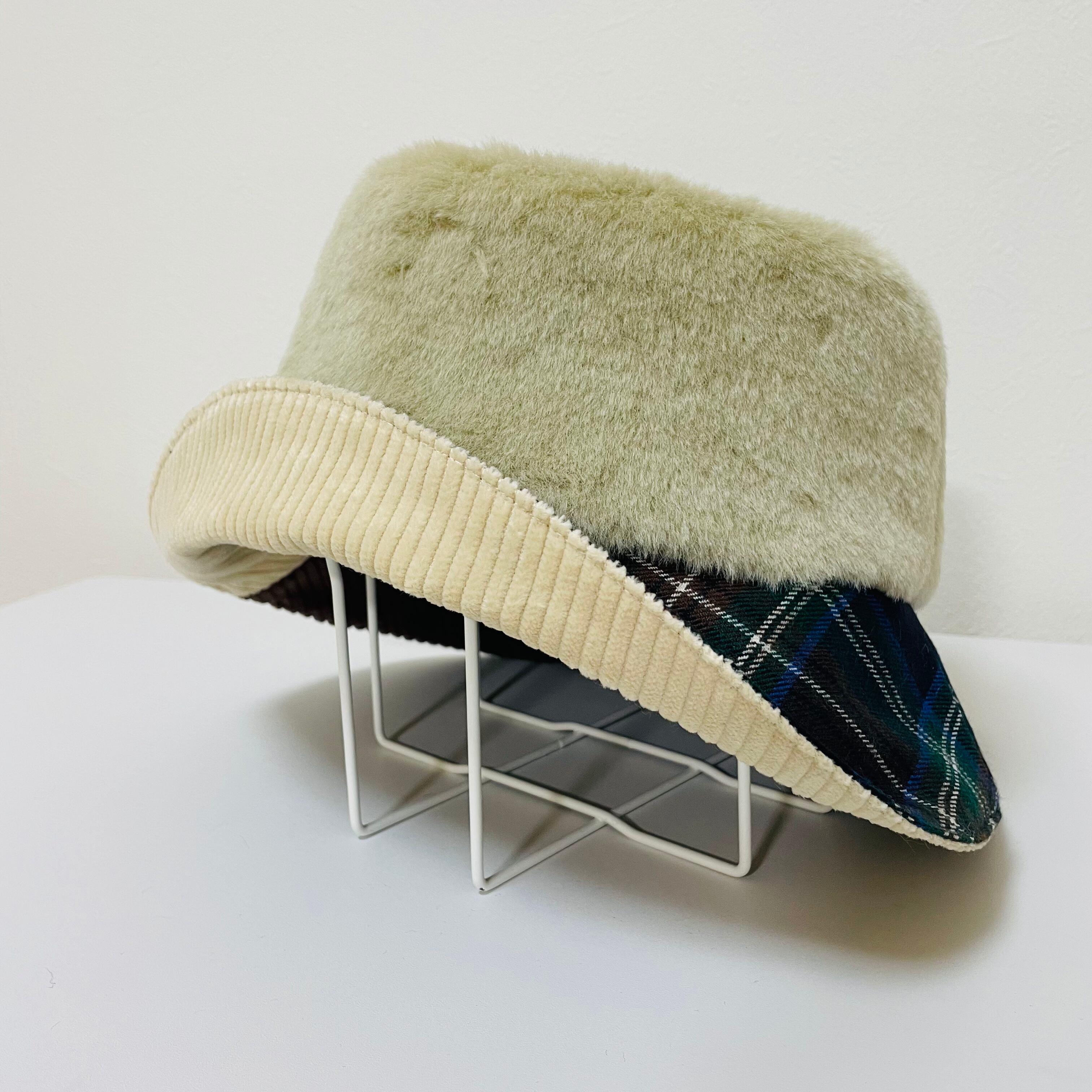 MLサイズ!グルリと白モコモコ✖️グリーンチェックなカラリバ帽