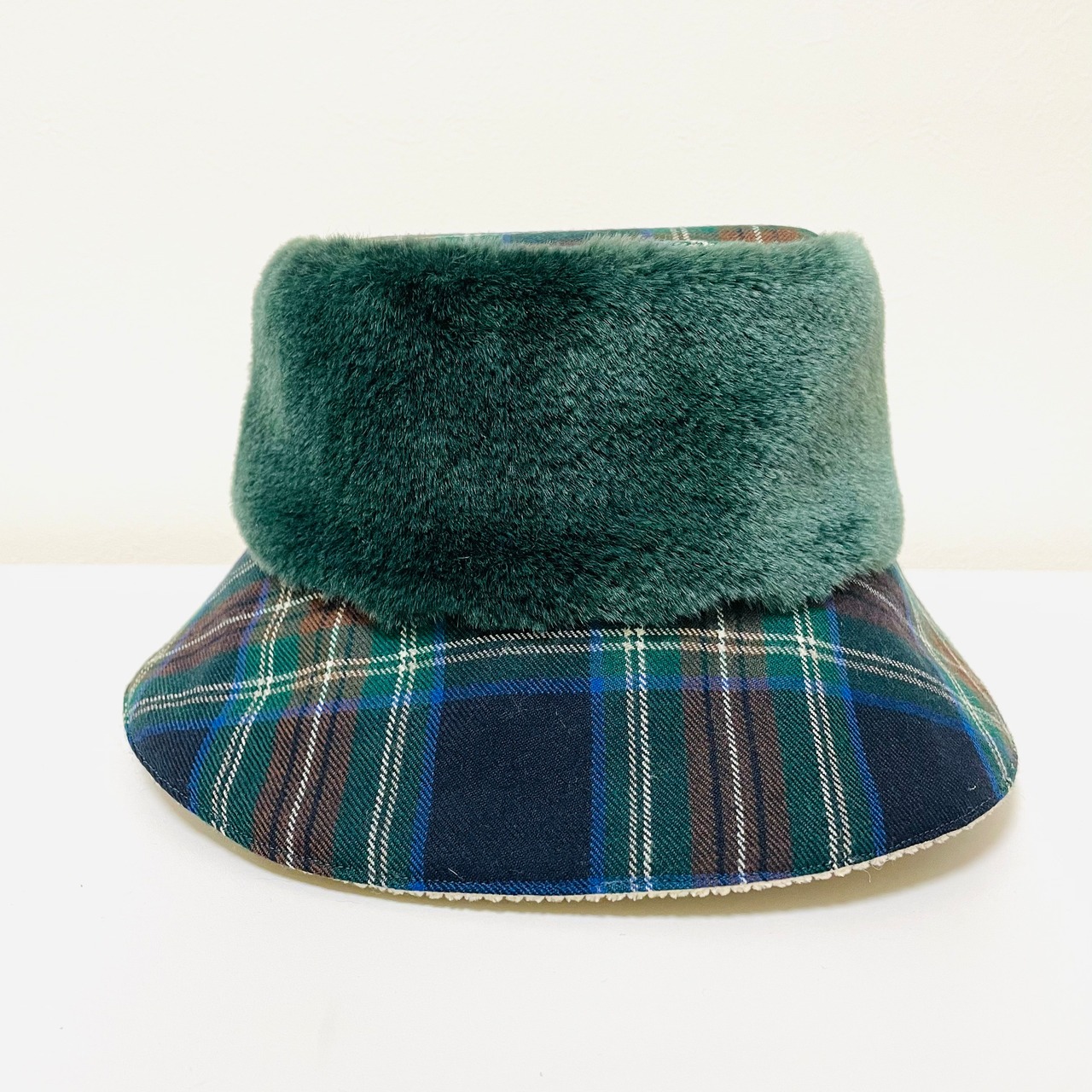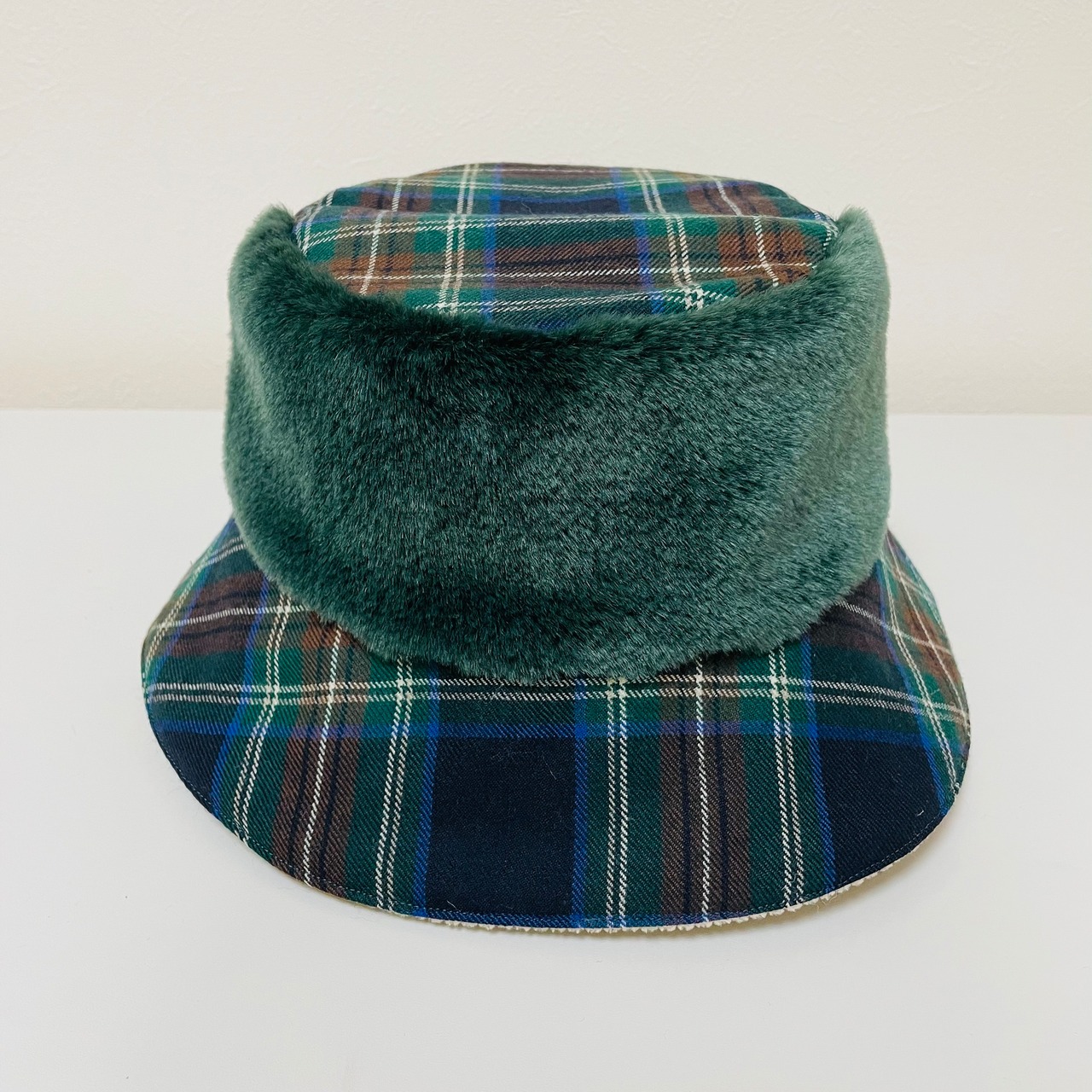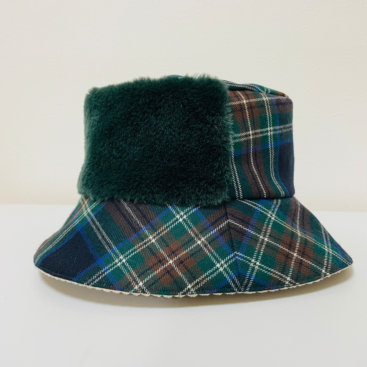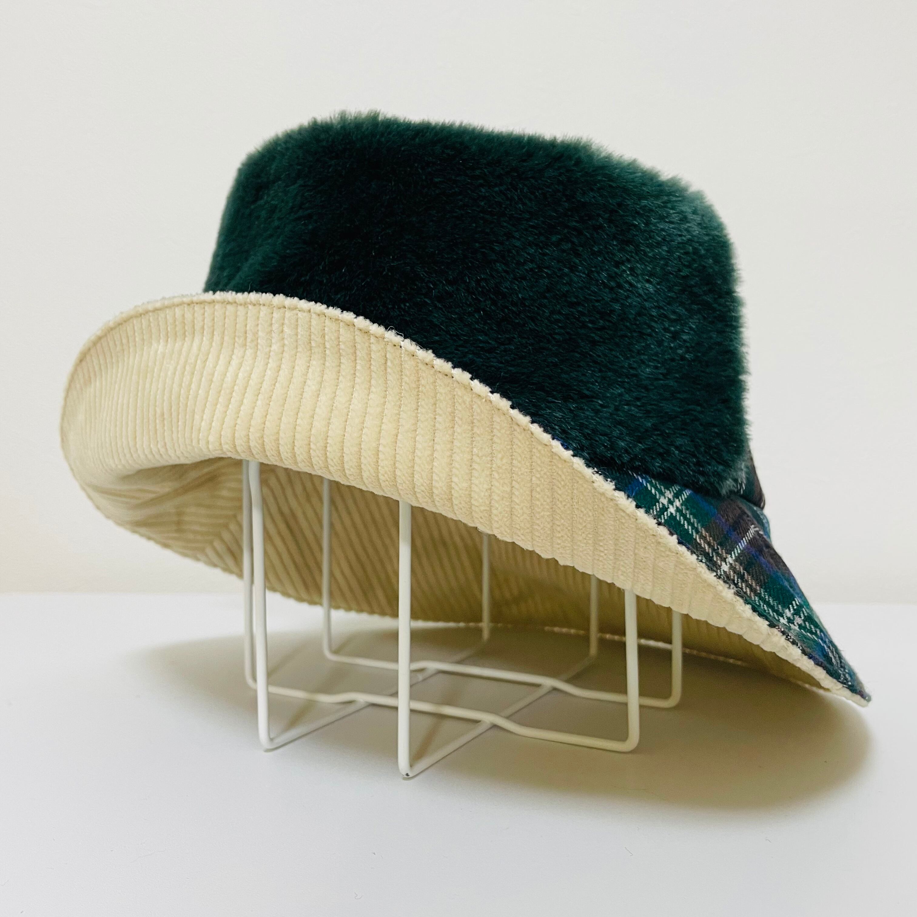 MLサイズ!グリーンモコモコとネイビーチェックなカラリバ帽